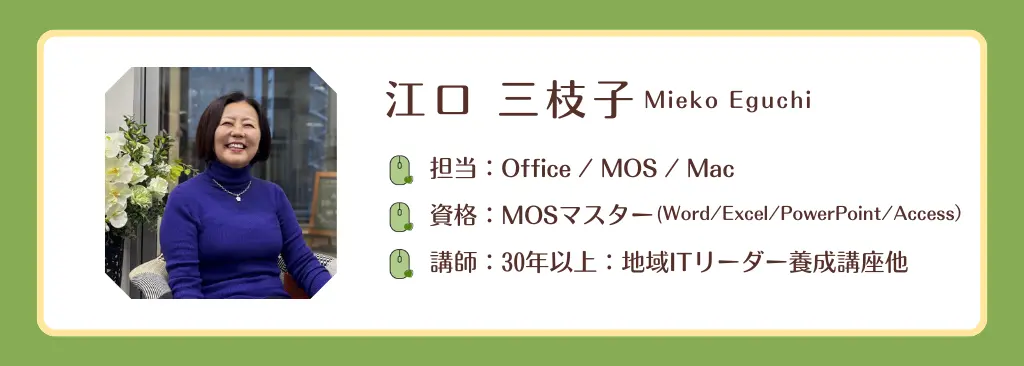 いつも笑顔で落ち着いたレッスンの江口先生は、長年通われている受講生さまにも大人気。Office系はもちろんExcelVBA、Mac、スマホタブレット、生成AIまで、どんなことでも任せられる頼もしい存在です。