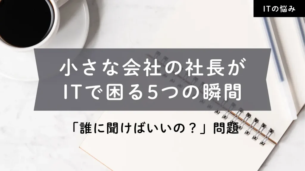 小さな会社の社長は、なぜITで困るのか 小さな会社の社長と話していると、よく聞く言葉があります。「ITのことって、誰に聞けばいいの?」 パソコンやインターネットは、今やどんな業種でも欠かせないものです。しかし、小さな会社 … 続きを読む 小さな会社の社長がITで困る5つの瞬間|「誰に聞けばいいの?」問題