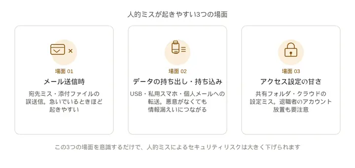 この3つの場面を意識するだけで、人的ミスのリスクは大きく下げられます